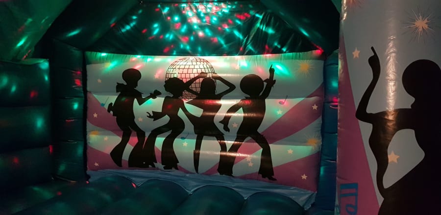Disco Bouncy Castle with bluetooth speaker and disco lights available for hire in the north east of england county Durham.