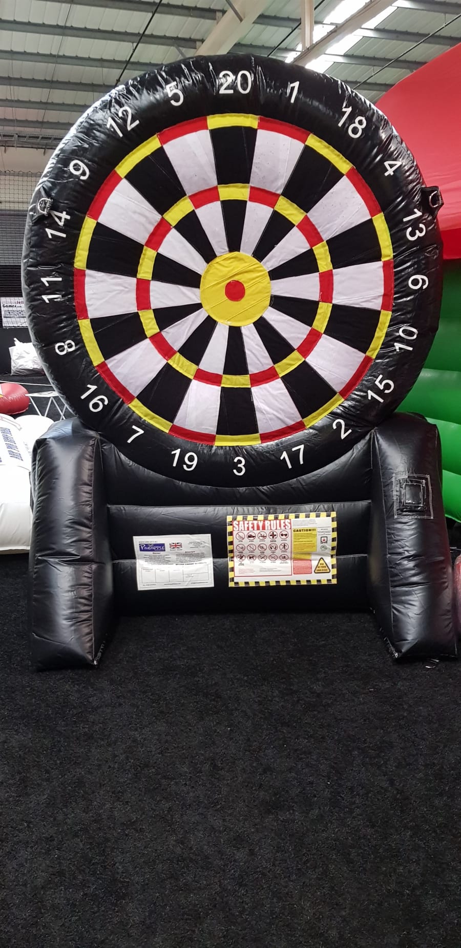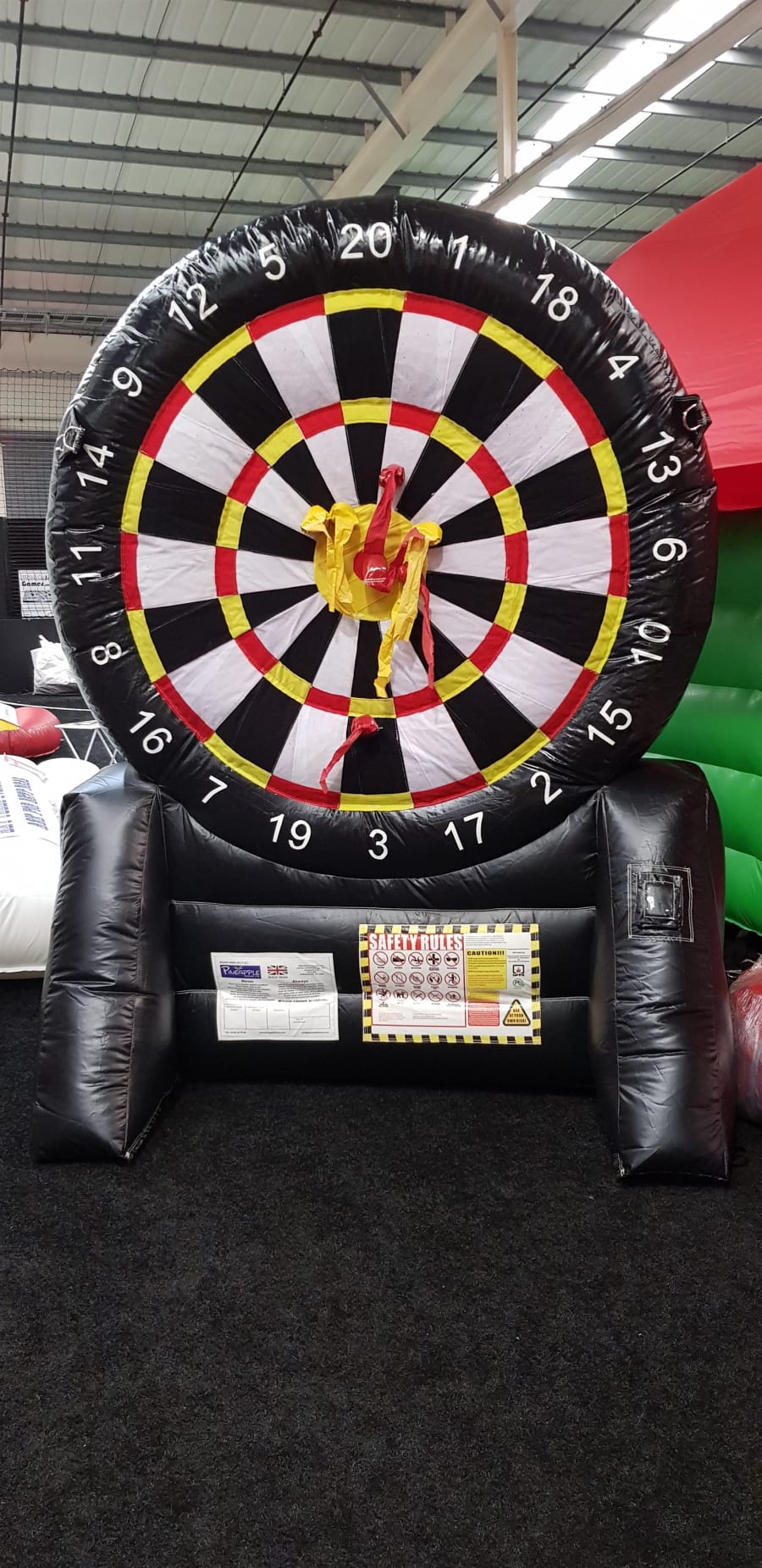 This is our 8ft tall inflatable darts game. Do you have the skill to hit a " one hundred and eighty " or even a " bullseye ". It doesn't matter if you aren't very good with the arrows on a real dart board as this is a completely different way to play the great pub classic. It's great fun that everyone can get involved with kids, mams, dad's grannys and grandpa's. It's a game for everyone.